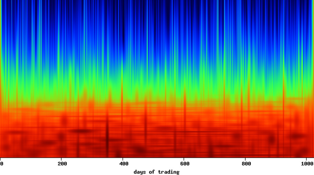 This contour plot has been created using rainbow colormap: blue color means low value, red means high value. The example above shows us moments of high volatility, marked by local concentration of the red color. The results of this plotting method are dark red, vertical, sharp shapes. When MP map is applied into stock market index in selected periods of time, one can extract important information about the situation on the market or on its selected sector. Study of the history of stock market finds the existence of one interesting regularity - most of falling market trends start rapidly, but most of raising trends - mildly. When the investor finds vertical, sharp shape on the MP map, he can expect incoming falling trend (bear market). Using MP maps can be significant for the investor in planning his own stock market decisions.