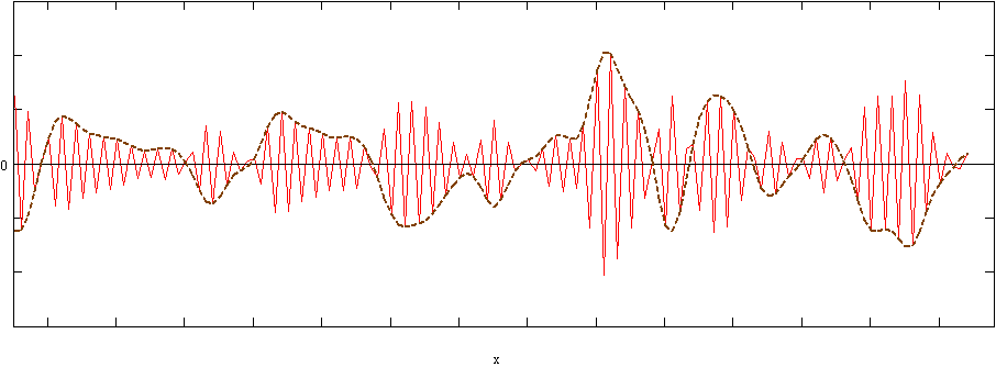 The graph above presents a line having rapid changes being too fast, which seems to be chaotic, but this is an illusory impression, because several regularities of this time series can be followed easily. One can find a way to eliminate this illusory chaos - smoothing functions can be applied to achieve this. As a result we get a graph being a boundary of the red curve.